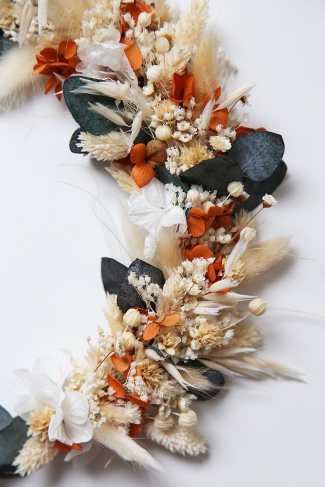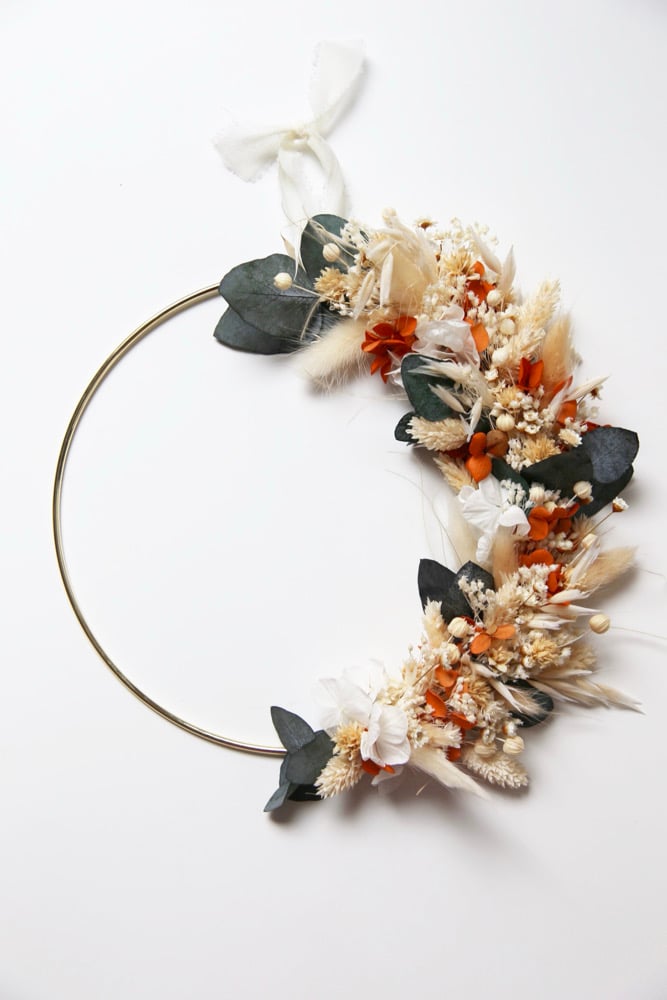 La couronne en fleurs séchées est personnalisable avec un mot/prénom de maximum 5 lettres. Vous pouvez également l'acheter sans personnalisation.