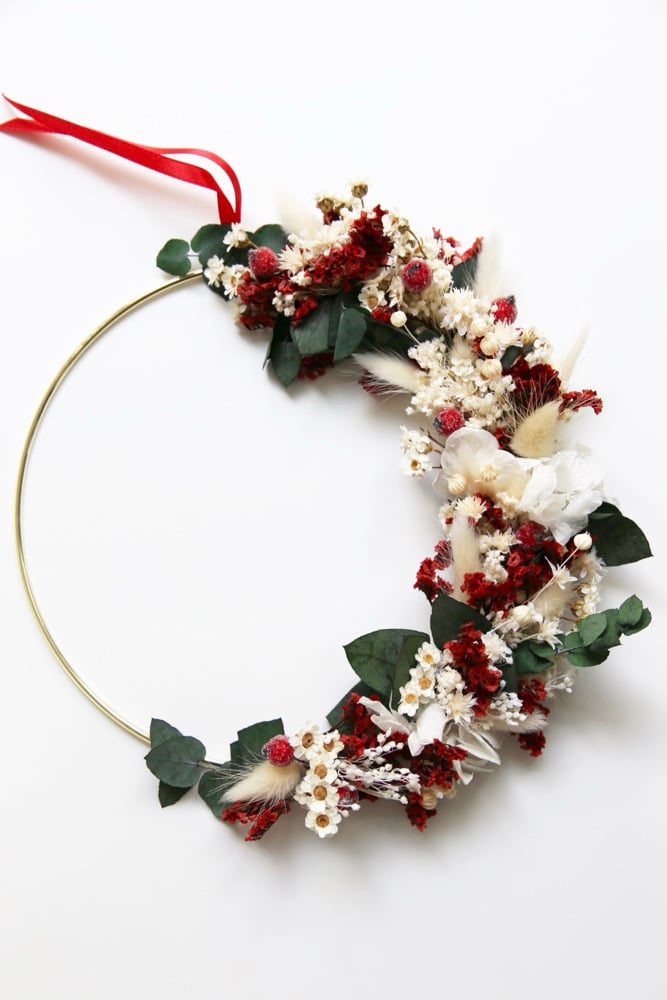 La couronne en fleurs séchées est personnalisable avec un mot/prénom de maximum 5 lettres. Vous pouvez également l'acheter sans personnalisation.
