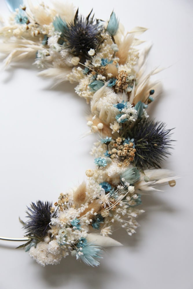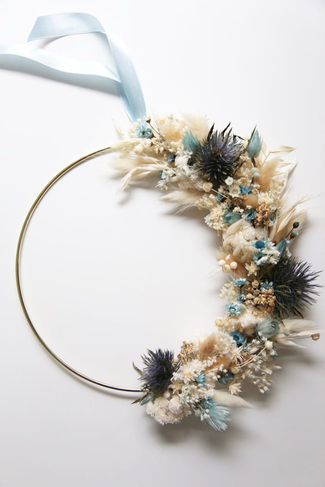 La couronne en fleurs séchées est personnalisable avec un mot/prénom de maximum 5 lettres. Vous pouvez également l'acheter sans personnalisation.